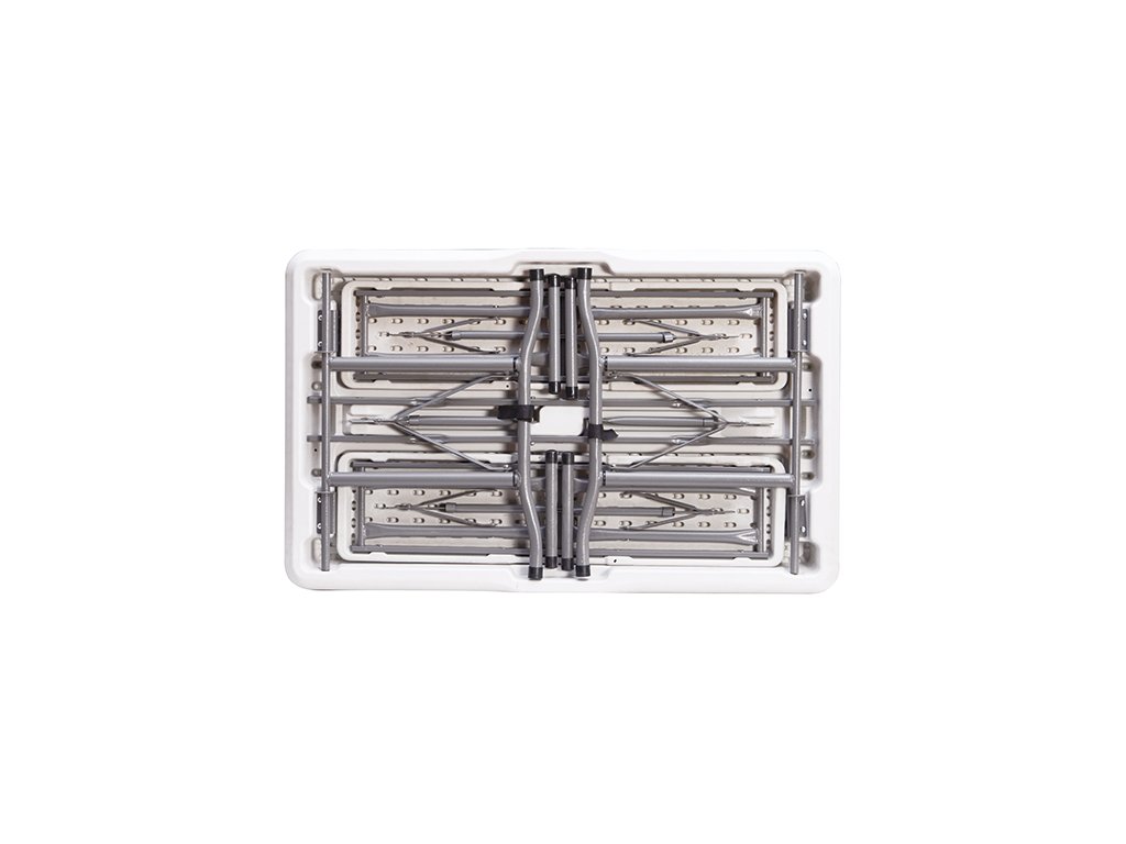 Zapakowane w kartonowe pudełko z ławkami o wymiarach 107 x 67 x 10 cm. Waga całego zestawu to 19 kg (21 kg z kartonem). Materiał składanego stołu i krzeseł składa się z metalowych, lakierowanych podstaw (profil 25 x 1,00 mm) oraz wytrzymałej białej płyty HDPE (grubość 4,0 cm). Nadaje się również do użytku na zewnątrz, jest odporny na wodę i promieniowanie UV. Płyta HDPE wykonana jest z nowego, czystego polietylenu o wysokiej wytrzymałości, nie pochodzącego z recyklingu.